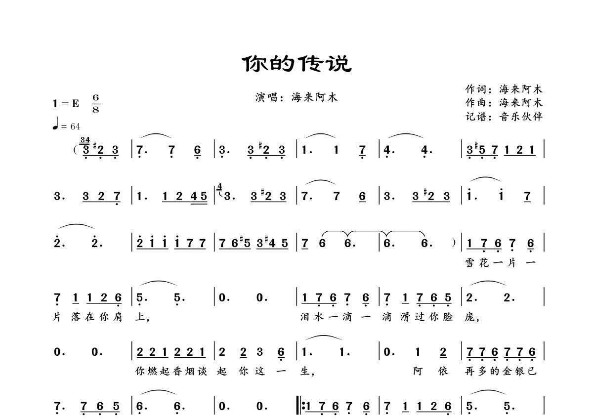 《你的传说》是海来阿木演唱的一首歌曲,拍号为6/8拍,歌曲速度为每分钟64拍,这份简谱共有两张高清图谱,图谱由 @音乐伙伴 编配上传。