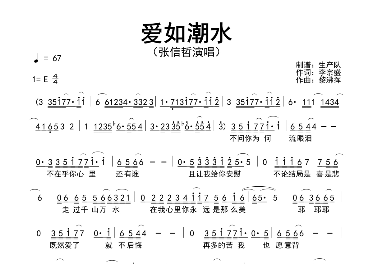 《爱如潮水》是张信哲演唱的一首歌曲,原版简谱,拍号为4/4拍,歌曲速度为每分钟67拍,这份简谱共有一张高清图谱,图谱由 @生产队 编配上传张信哲演唱的经典歌曲《爱如潮水》原版简谱。