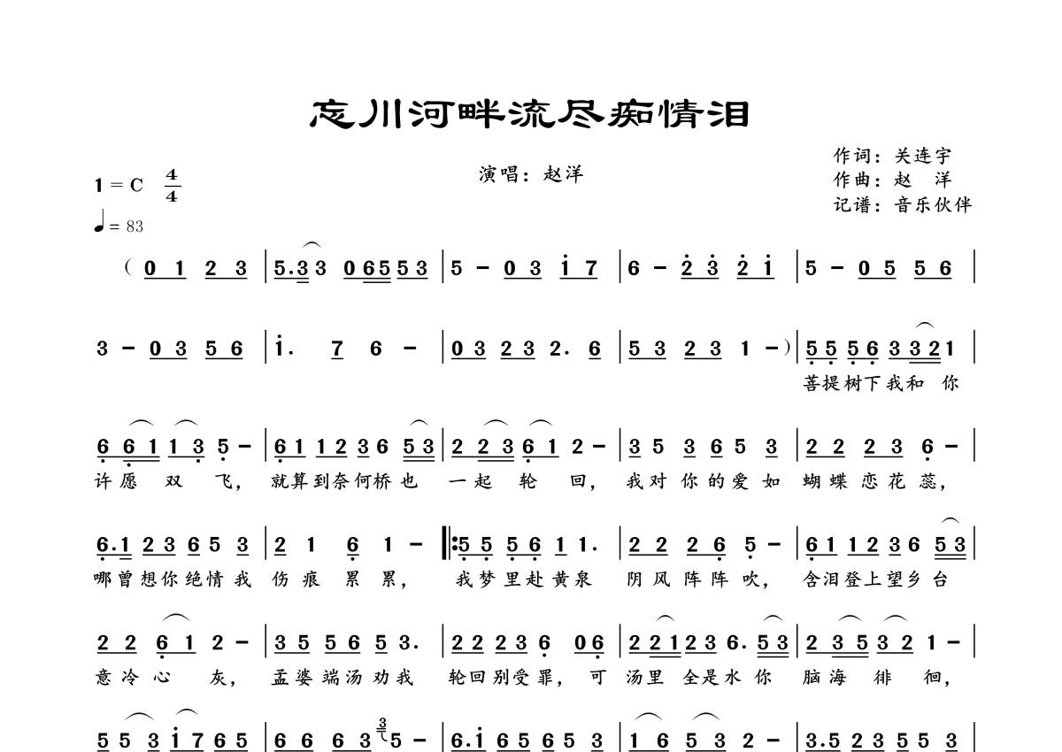 《忘川河畔流尽痴情泪》是赵洋演唱的一首歌曲,拍号为4/4拍,歌曲速度为每分钟83拍,这份简谱共有一张高清图谱,图谱由 @音乐伙伴 编配上传。
