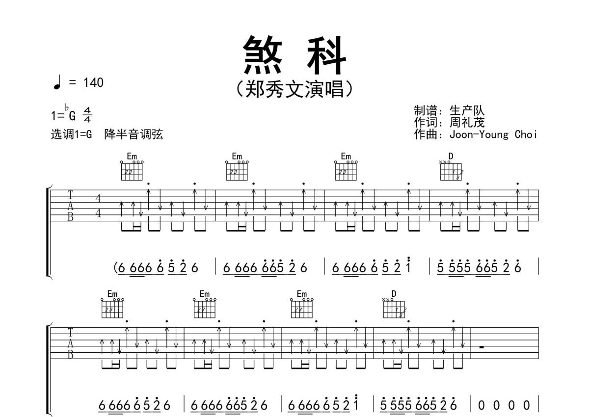 《煞科》是郑秀文演唱的一首歌曲,精编完美版,拍号为4/4拍,歌曲速度为每分钟140拍,歌曲原调为Gb调,但由于原调指法比较难,为了方便弹奏,本吉他谱采用的是G调指法编配,降半音调弦弹奏即为原调,当然也可以根据自己的音域决定是否调弦,这份吉他谱共有四张高清图谱,图谱由 @生产队 编配上传,图谱使用六线谱编配,包含吉他和弦指法、简谱以及歌词部分,使用这份煞科吉他谱,可以让你更加方便地掌握这首歌曲的弹唱技巧,快来尝试吧。《煞科》是郑秀文演唱的歌曲,由周礼茂、Mc仁填词,Joon-Young Choi谱曲,收录在专辑《Ladies First》中。本吉他谱根据原版G调指法编配,完整的前奏、间奏和solo编配,扫弦切音节奏,精编完美版,怀旧经典!。