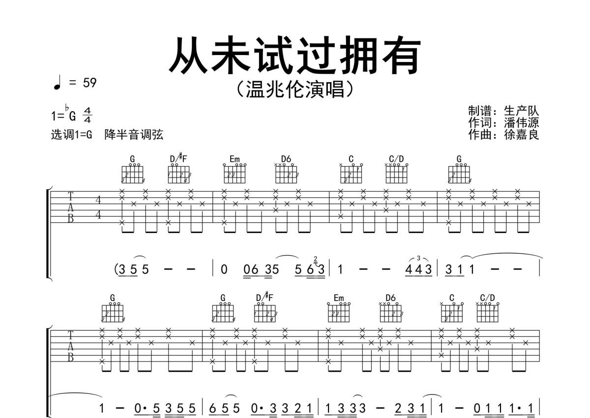 《从未试过拥有》是温兆伦演唱的一首歌曲,精编完美版,拍号为4/4拍,歌曲速度为每分钟59拍,歌曲原调为Gb调,但由于原调指法比较难,为了方便弹奏,本吉他谱采用的是G调指法编配,降半音调弦弹奏即为原调,当然也可以根据自己的音域决定是否调弦,这份吉他谱共有三张高清图谱,图谱由 @生产队 编配上传,图谱使用六线谱编配,包含吉他和弦指法、简谱以及歌词部分,使用这份从未试过拥有吉他谱,可以让你更加方便地掌握这首歌曲的弹唱技巧,快来尝试吧。《从未试过拥有》是温兆伦演唱的一首经典粤语歌曲,潘伟源作词,徐嘉良作曲,收录在专辑《今生无悔》中。本吉他谱根据原版采用G调指法编配,注意各段落不同节奏型的层次感,怀旧经典!。