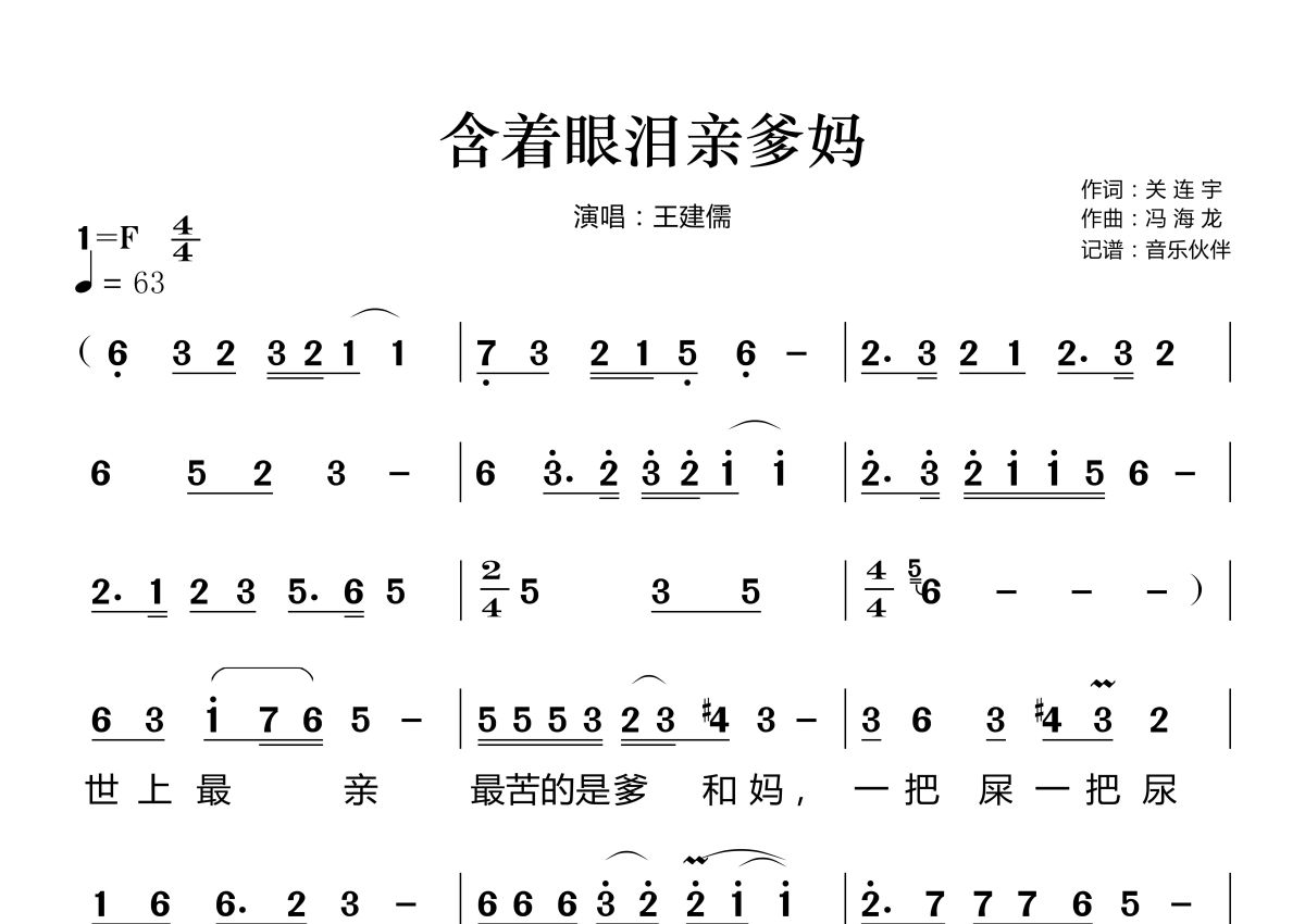 《含着眼泪亲爹妈》是王建儒演唱的一首歌曲,这份简谱共有两张高清图谱,图谱由 @音乐伙伴 编配上传。