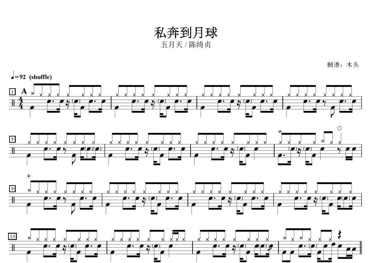 五月天 / 陈绮贞《私奔到月球》鼓谱 - 架子鼓谱