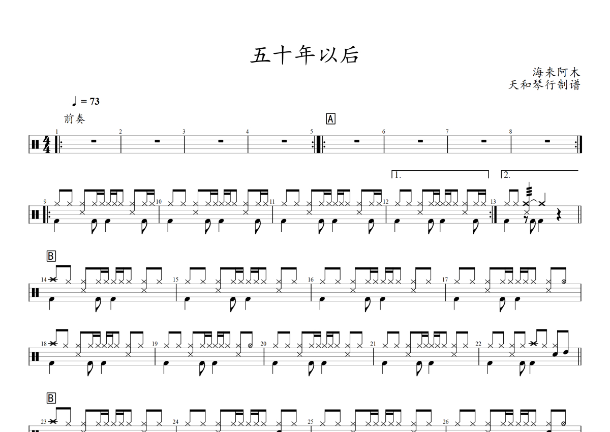 《五十年以后》是海来阿木演唱的一首歌曲,拍号为4/4拍,歌曲速度为每分钟73拍,这份架子鼓谱共有两张高清图谱,图谱由 @音符喷血者 编配上传,图谱使用五线谱编配,使用这份五十年以后架子鼓谱,你将能够轻松地敲打出这首海来阿木的五十年以后,快来尝试吧。