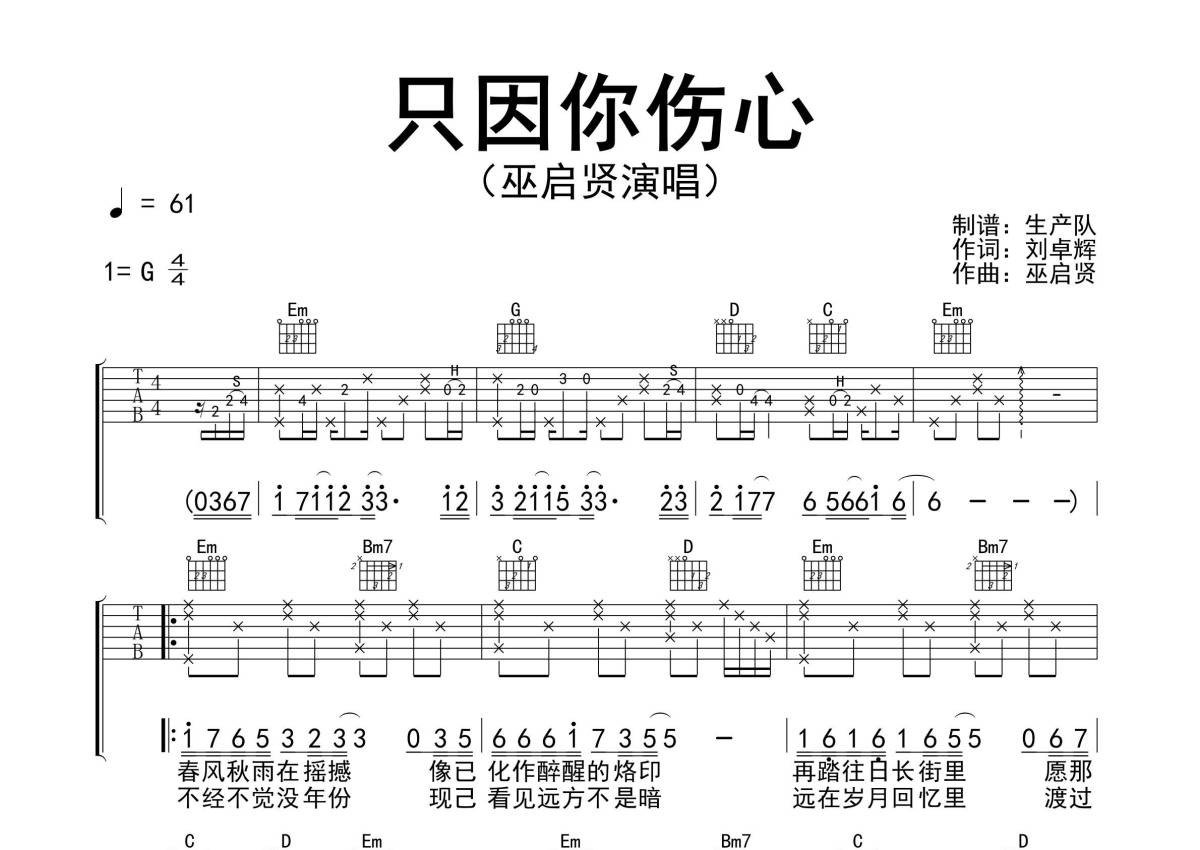 《只因你伤心》是巫启贤演唱的一首歌曲,精编完美版,拍号为4/4拍,歌曲速度为每分钟61拍,歌曲原调为G调,本吉他谱采用的是G调指法编配,演奏时不需要使用变调夹即为原调,这份吉他谱共有两张高清图谱,图谱由 @生产队 编配上传,图谱使用六线谱编配,包含吉他和弦指法、简谱以及歌词部分,使用这份只因你伤心吉他谱,可以让你更加方便地掌握这首歌曲的弹唱技巧,快来尝试吧。《只因你伤心》是华语流行乐男歌手巫启贤的一首粤语歌,收录于专辑《因为你》。本吉他谱根据原版G调指法编配,完整的前奏、间奏、尾奏solo编配,怀旧经典!。