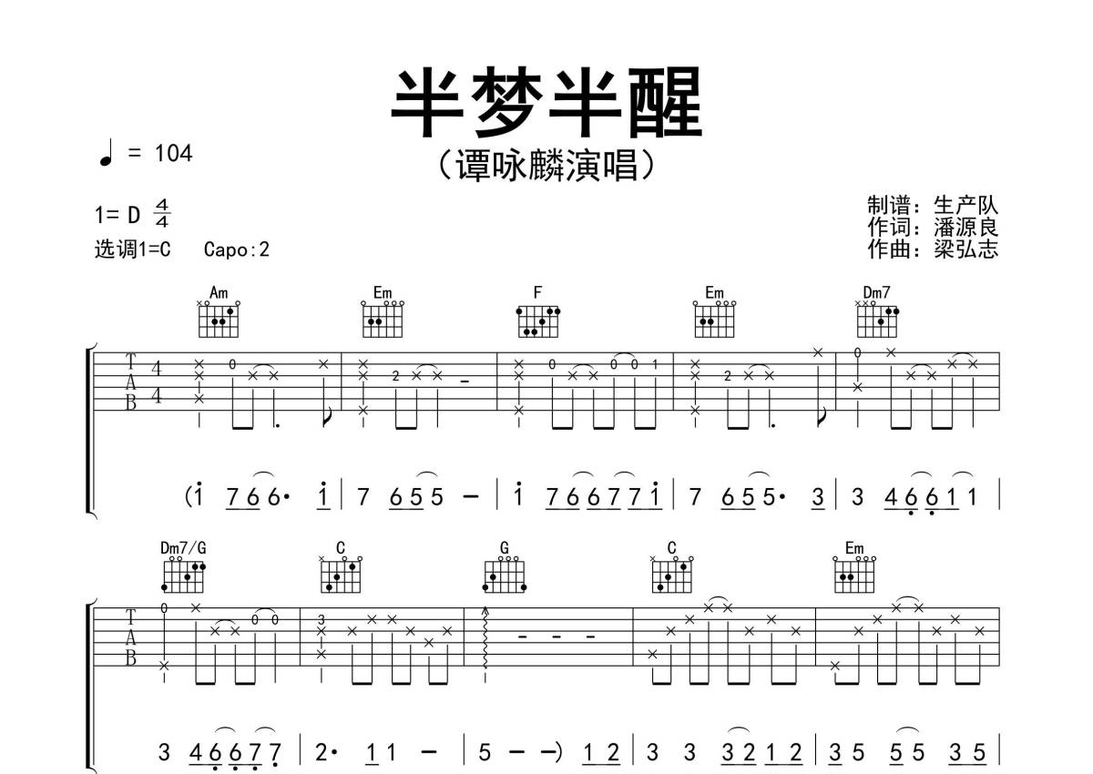 《半梦半醒》是谭咏麟演唱的一首歌曲,精编完美版,拍号为4/4拍,歌曲速度为每分钟104拍,歌曲原调为D调,但由于原调指法比较难,为了方便弹奏,本吉他谱采用的是C调指法编配,变调夹2品弹奏即为原调,当然也可以根据自己的音域改变变调夹位置,或者通过改变和弦调性,以方便自己弹奏,这份吉他谱共有三张高清图谱,图谱由 @生产队 编配上传,图谱使用六线谱编配,包含吉他和弦指法、简谱以及歌词部分,使用这份半梦半醒吉他谱,可以让你更加方便地掌握这首歌曲的弹唱技巧,快来尝试吧。《半梦半醒》是谭咏麟演唱的一首粤语歌曲,由梁弘志作曲,潘源良填词 ,收录在谭咏麟1988年2月12日由环球唱片发行的粤语专辑《迷惑》中 ,该曲亦是电影《爱的逃兵》的插曲 。本吉他谱根据原版采用C调指法编配,精编完美版,怀旧经典!。