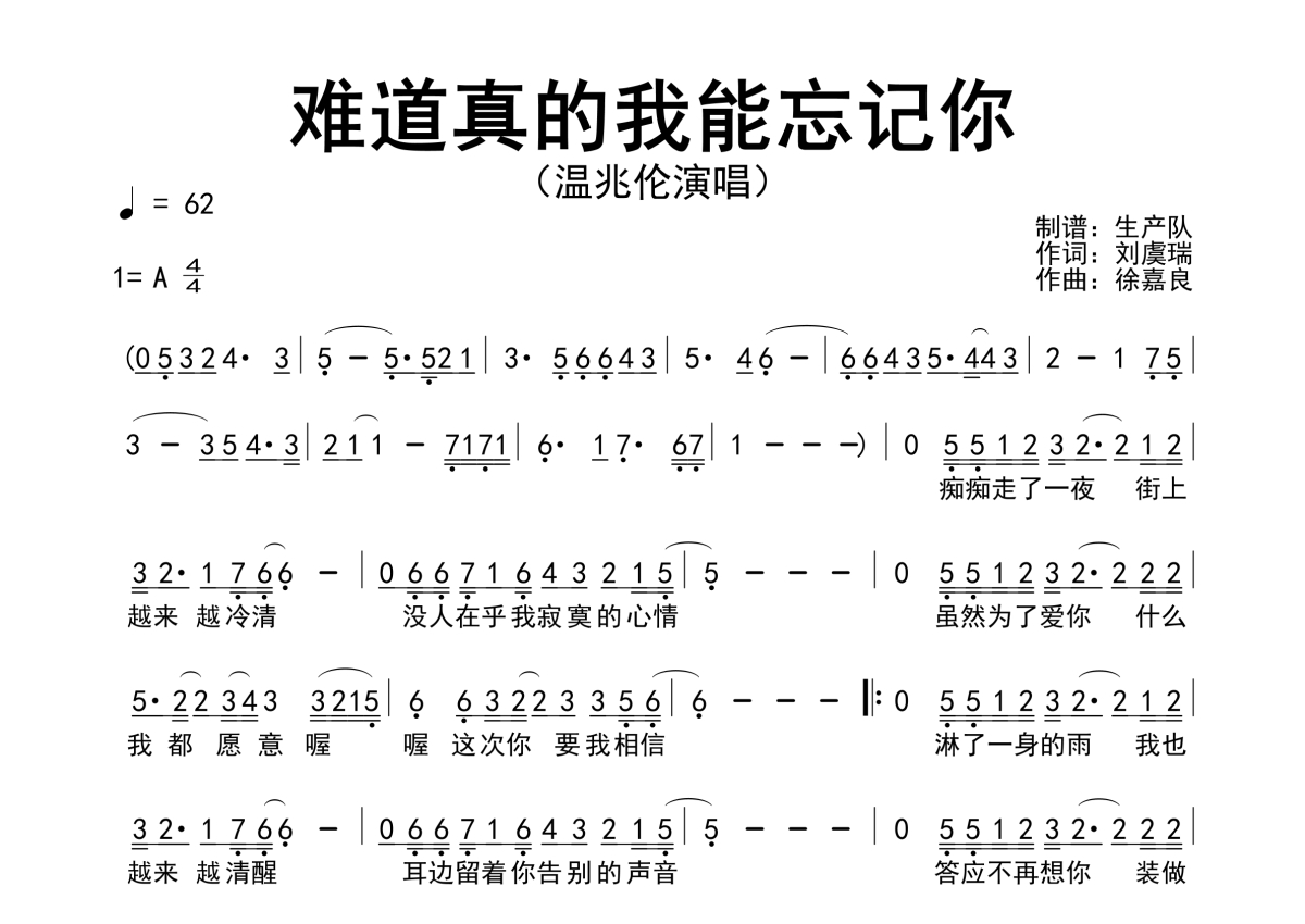 《难道真的我能忘记你》是温兆伦演唱的一首歌曲,原版简谱,拍号为4/4拍,歌曲速度为每分钟62拍,这份简谱共有一张高清图谱,图谱由 @生产队 编配上传温兆伦演唱的经典歌曲《难道真的我能忘记你》原版简谱。