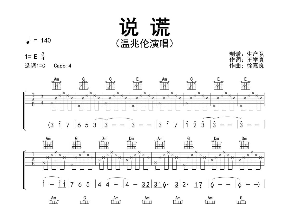 温兆伦《说谎》吉他谱 - C调弹唱六线谱 - 精编完美版