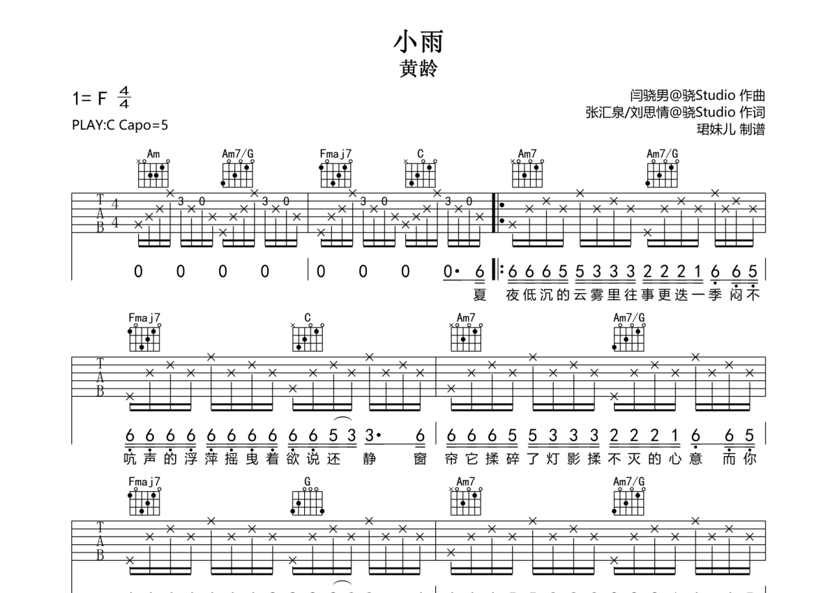 小雨吉他谱 - 黄龄 - C调弹唱六线谱