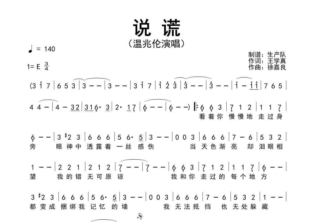 《说谎》是温兆伦演唱的一首歌曲,原版简谱,拍号为3/4拍,歌曲速度为每分钟140拍,这份简谱共有一张高清图谱,图谱由 @生产队 编配上传温兆伦演唱的经典歌曲《说谎》原版简谱。