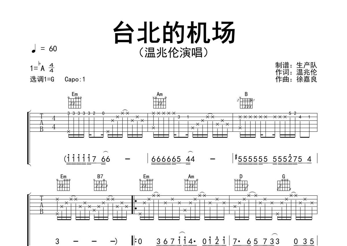 《台北的机场》是温兆伦演唱的一首歌曲,精编完美版,拍号为4/4拍,歌曲速度为每分钟60拍,歌曲原调为Ab调,但由于原调指法比较难,为了方便弹奏,本吉他谱采用的是G调指法编配,变调夹1品弹奏即为原调,当然也可以根据自己的音域改变变调夹位置,或者通过改变和弦调性,以方便自己弹奏,这份吉他谱共有三张高清图谱,图谱由 @生产队 编配上传,图谱使用六线谱编配,包含吉他和弦指法、简谱以及歌词部分,使用这份台北的机场吉他谱,可以让你更加方便地掌握这首歌曲的弹唱技巧,快来尝试吧。《台北的机场》是由温兆伦演唱的一首经典歌曲,收录在其于1997年12月1日发行的专辑《情结》中。本吉他谱根据原版G调指法编配,精准的前奏、间奏和solo编配,精编一音不差版,怀旧经典!。