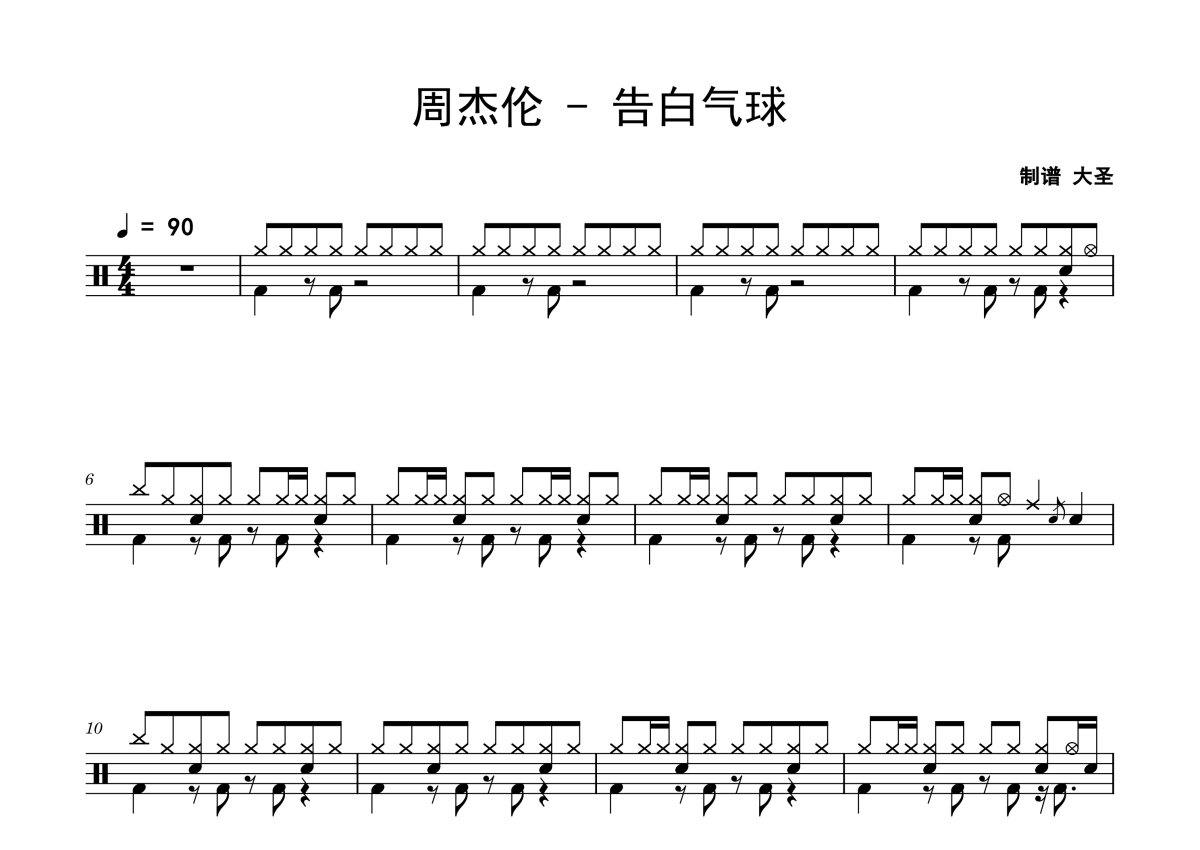 《告白气球》是周杰伦演唱的一首歌曲,这份架子鼓谱共有三张高清图谱,图谱由 @Sawubona 编配上传,图谱使用五线谱编配,使用这份告白气球架子鼓谱,你将能够轻松地敲打出这首周杰伦的告白气球,快来尝试吧。