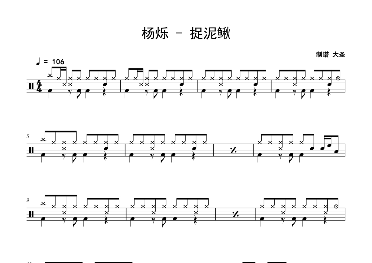 《捉泥鳅》是杨烁演唱的一首歌曲,这份架子鼓谱共有两张高清图谱,图谱由 @Sawubona 编配上传,图谱使用五线谱编配,使用这份捉泥鳅架子鼓谱,你将能够轻松地敲打出这首杨烁的捉泥鳅,快来尝试吧。