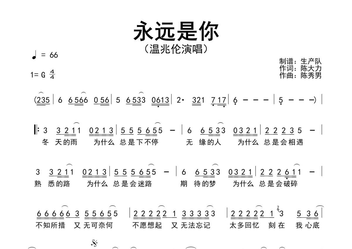 《永远是你》是温兆伦演唱的一首歌曲,原版简谱,拍号为4/4拍,歌曲速度为每分钟66拍,这份简谱共有一张高清图谱,图谱由 @生产队 编配上传温兆伦演唱的经典歌曲《永远是你》原版简谱,完整的前奏、间奏、尾奏和solo编配!。