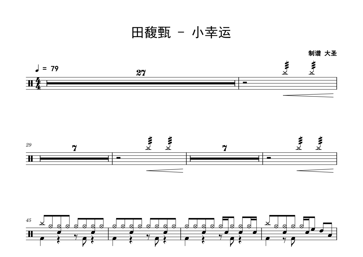 《小幸运》是田馥甄演唱的一首歌曲,拍号为4/4拍,歌曲速度为每分钟79拍,这份架子鼓谱共有两张高清图谱,图谱由 @Sawubona 编配上传,图谱使用五线谱编配,使用这份小幸运架子鼓谱,你将能够轻松地敲打出这首田馥甄的小幸运,快来尝试吧。