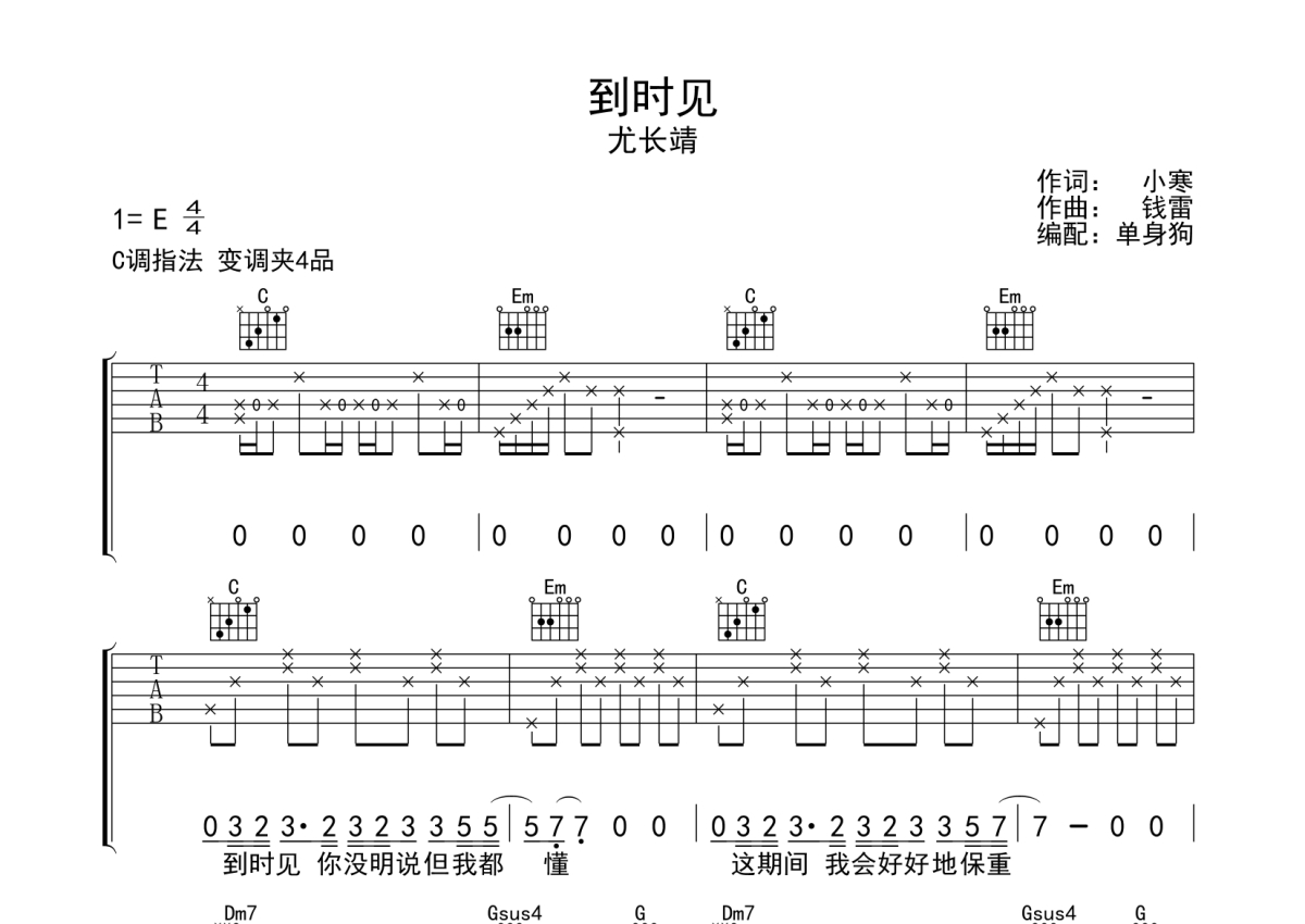 《到时见》是尤长靖演唱的一首歌曲,拍号为4/4拍,歌曲原调为E调,但由于原调指法比较难,为了方便弹奏,本吉他谱采用的是C调指法编配,变调夹4品弹奏即为原调,当然也可以根据自己的音域改变变调夹位置,或者通过改变和弦调性,以方便自己弹奏,这份吉他谱共有三张高清图谱,图谱由 @单身狗 编配上传,图谱使用六线谱编配,包含吉他和弦指法、简谱以及歌词部分,使用这份到时见吉他谱,可以让你更加方便地掌握这首歌曲的弹唱技巧,快来尝试吧。