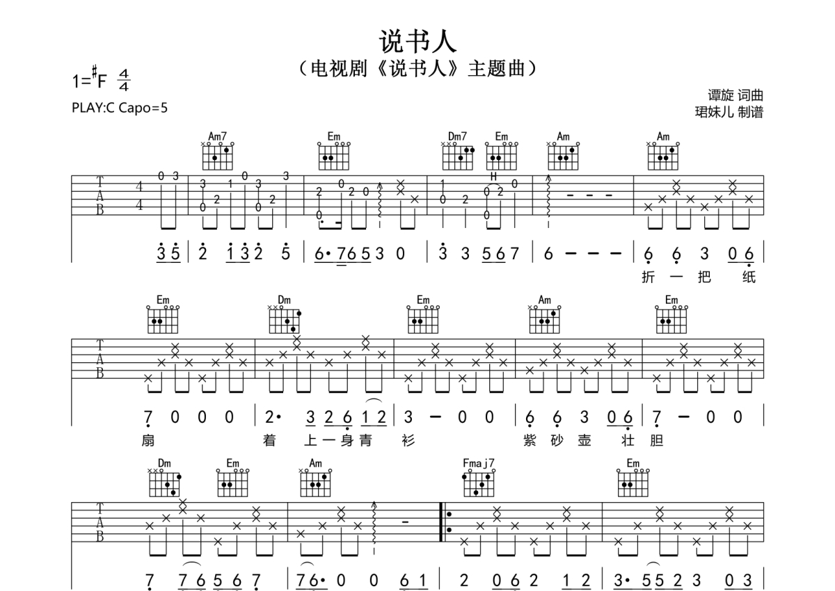 《说书人》是小沈阳演唱的一首歌曲,拍号为4/4拍,歌曲速度为每分钟85拍,歌曲原调为C调,本吉他谱采用的是C调指法编配,变调夹5品弹奏即为原调,当然也可以根据自己的音域改变变调夹位置,或者通过改变和弦调性,以方便自己弹奏,这份吉他谱共有两张高清图谱,图谱由 @珺妹儿 编配上传,图谱使用六线谱编配,包含吉他和弦指法、简谱以及歌词部分,使用这份说书人吉他谱,可以让你更加方便地掌握这首歌曲的弹唱技巧,快来尝试吧。