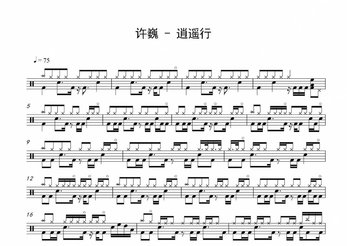 《逍遥行》是许巍演唱的一首歌曲,拍号为4/4拍,歌曲速度为每分钟75拍,这份架子鼓谱共有两张高清图谱,图谱由 @Sawubona 编配上传,图谱使用五线谱编配,使用这份逍遥行架子鼓谱,你将能够轻松地敲打出这首许巍的逍遥行,快来尝试吧。