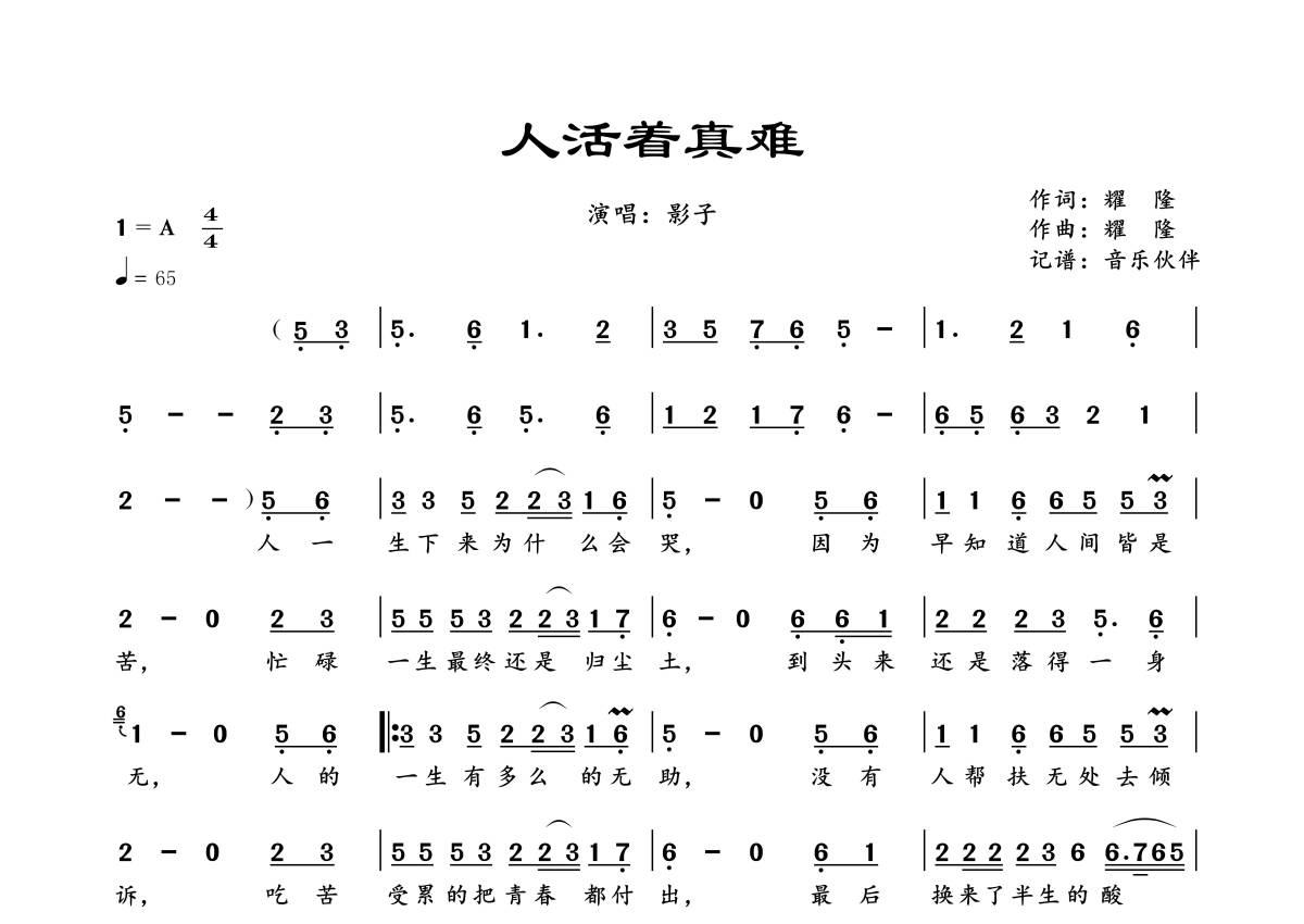 《人活着真难》是影子演唱的一首歌曲,拍号为4/4拍,歌曲速度为每分钟65拍,这份简谱共有一张高清图谱,图谱由 @音乐伙伴 编配上传。
