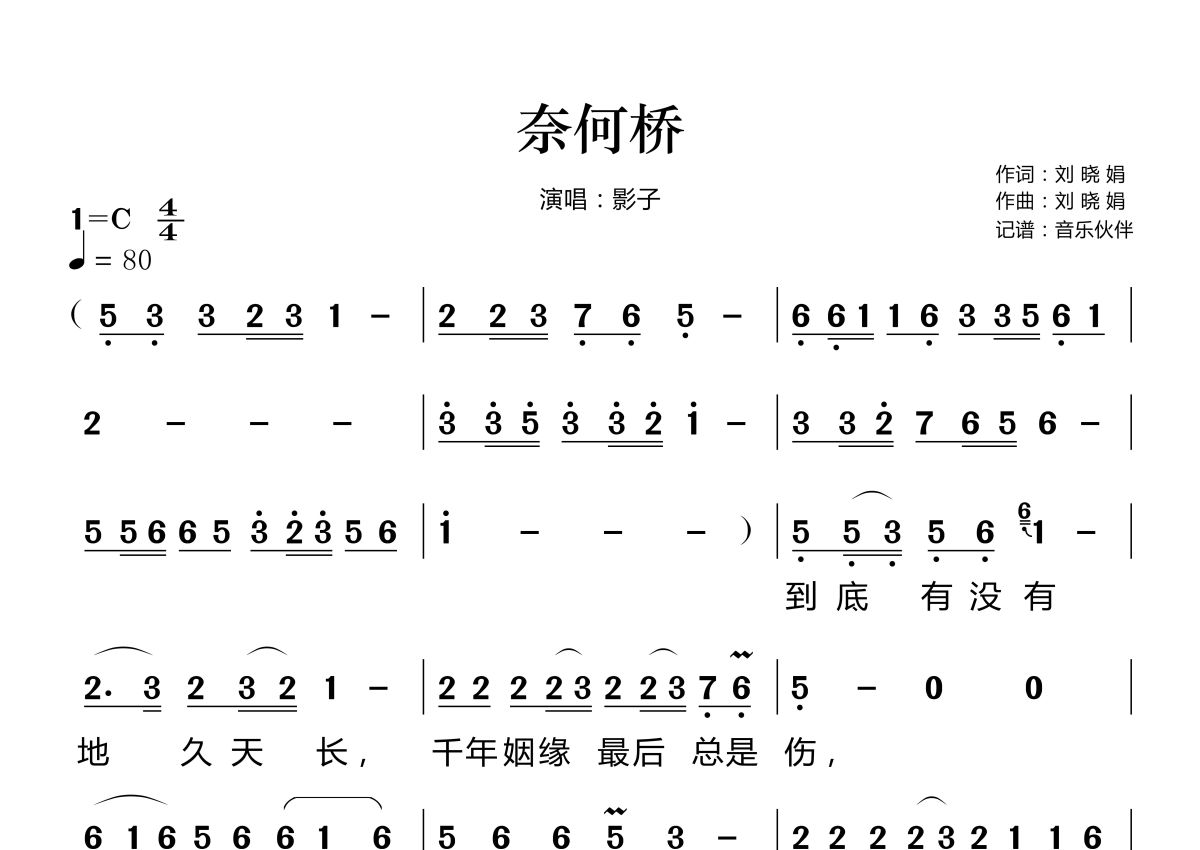 《奈何桥》是影子演唱的一首歌曲,这份简谱共有两张高清图谱,图谱由 @音乐伙伴 编配上传。