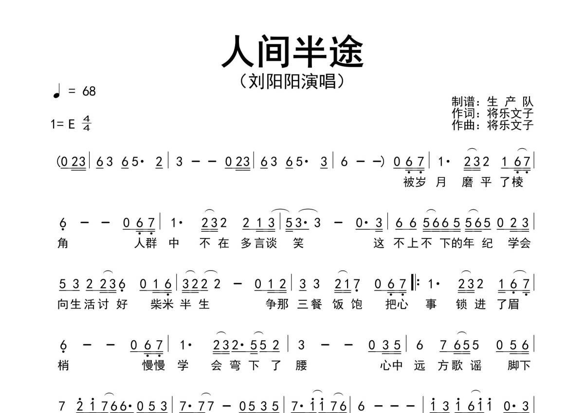 《人间半途》是刘阳阳演唱的一首歌曲,原版简谱,拍号为4/4拍,歌曲速度为每分钟68拍,这份简谱共有一张高清图谱,图谱由 @生产队 编配上传刘阳阳演唱的歌曲《人间半途》原版简谱,精准的前奏、间奏、尾奏和solo编配。
