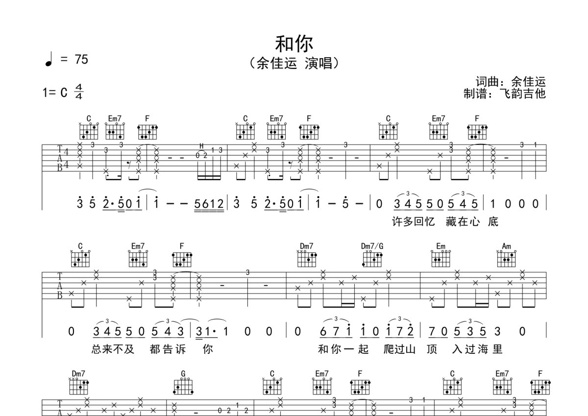 余佳运《和你》吉他谱 - C调弹唱六线谱