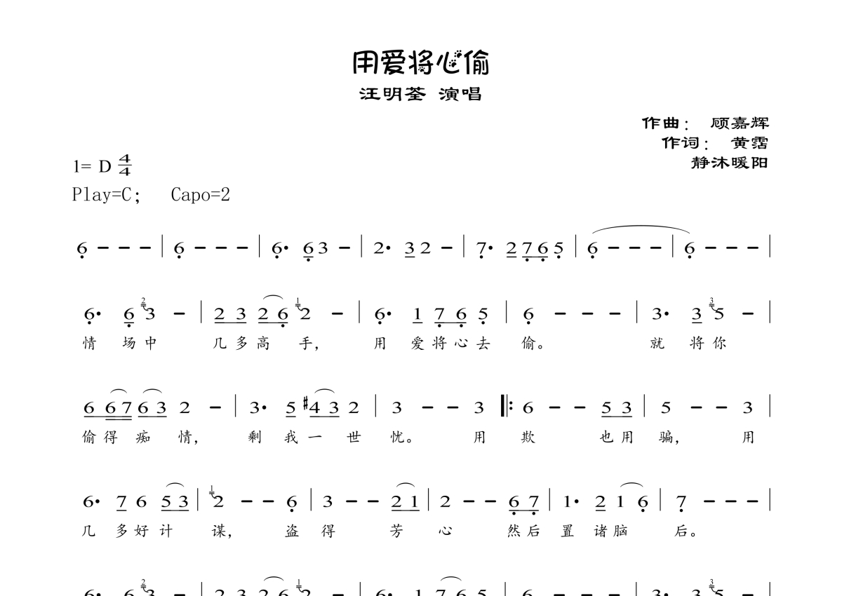 《用爱将心偷》是汪明荃演唱的一首歌曲,拍号为4/4拍,这份简谱共有一张高清图谱,图谱由 @静沐暖阳 编配上传。