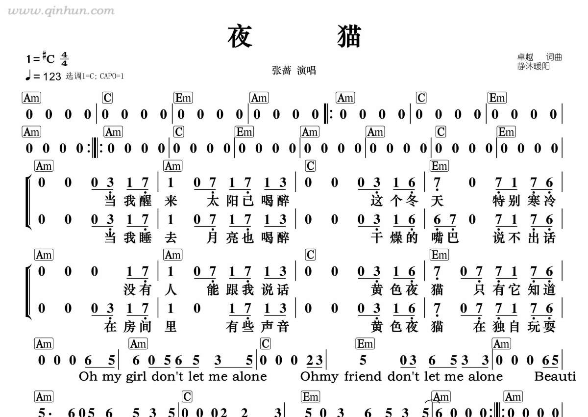 《夜猫》是张蔷演唱的一首歌曲,拍号为4/4拍,歌曲速度为每分钟123拍,这份简谱共有一张高清图谱,图谱由 @静沐暖阳 编配上传。