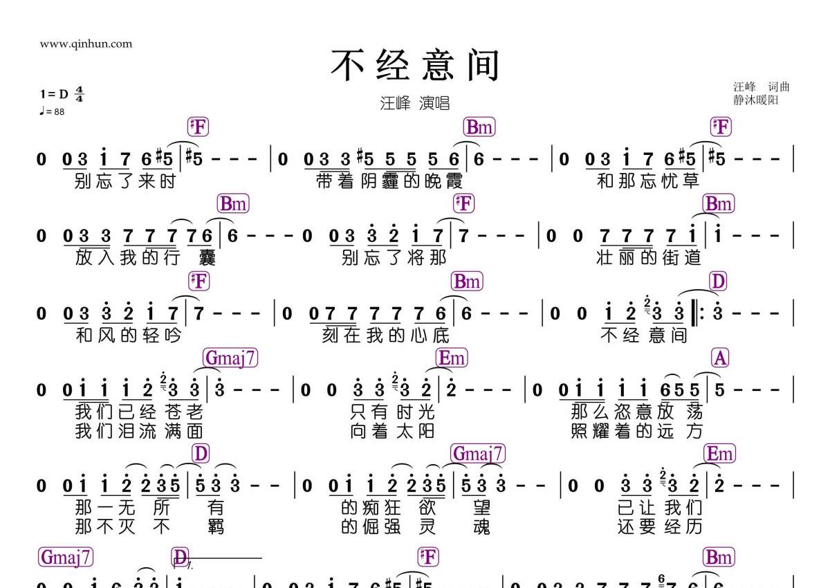 《不经意间》是达达乐队演唱的一首歌曲,拍号为4/4拍,歌曲速度为每分钟88拍,这份简谱共有一张高清图谱,图谱由 @静沐暖阳 编配上传。