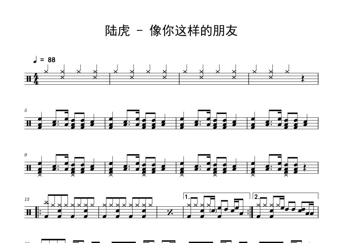 《像你这样的朋友》是陆虎演唱的一首歌曲,拍号为4/4拍,歌曲速度为每分钟88拍,这份架子鼓谱共有两张高清图谱,图谱由 @司空千落 编配上传,图谱使用五线谱编配,使用这份像你这样的朋友架子鼓谱,你将能够轻松地敲打出这首陆虎的像你这样的朋友,快来尝试吧。