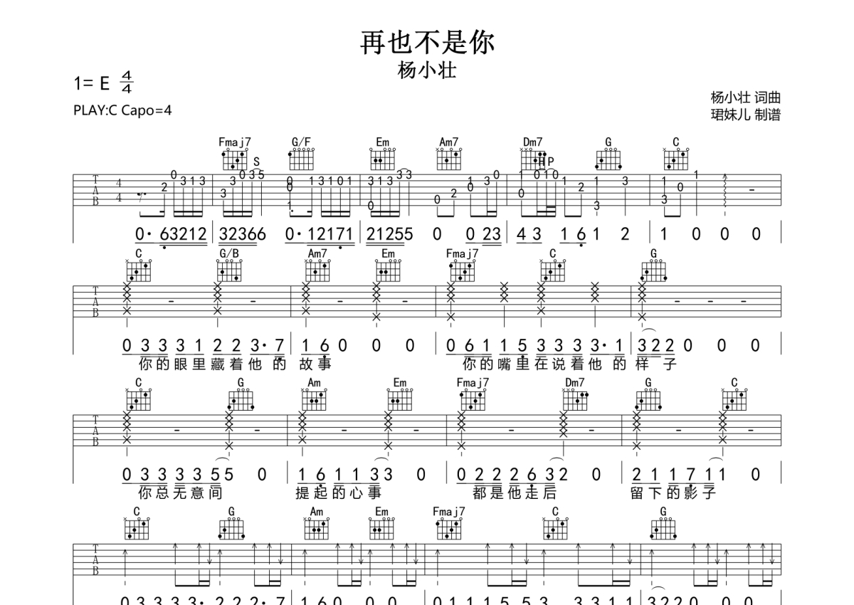 《再也不是你》是杨小壮演唱的一首歌曲,拍号为4/4拍,歌曲速度为每分钟85拍,歌曲原调为C调,本吉他谱采用的是C调指法编配,变调夹4品弹奏即为原调,当然也可以根据自己的音域改变变调夹位置,或者通过改变和弦调性,以方便自己弹奏,这份吉他谱共有两张高清图谱,图谱由 @珺妹儿 编配上传,图谱使用六线谱编配,包含吉他和弦指法、简谱以及歌词部分,使用这份再也不是你吉他谱,可以让你更加方便地掌握这首歌曲的弹唱技巧,快来尝试吧。