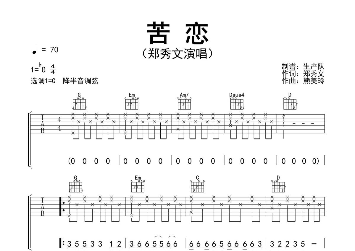 《苦恋》是郑秀文演唱的一首歌曲,精编民谣版,拍号为4/4拍,歌曲速度为每分钟70拍,歌曲原调为Gb调,但由于原调指法比较难,为了方便弹奏,本吉他谱采用的是G调指法编配,降半音调弦弹奏即为原调,当然也可以根据自己的音域决定是否调弦,这份吉他谱共有三张高清图谱,图谱由 @生产队 编配上传,图谱使用六线谱编配,包含吉他和弦指法、简谱以及歌词部分,使用这份苦恋吉他谱,可以让你更加方便地掌握这首歌曲的弹唱技巧,快来尝试吧。《苦恋》是郑秀文演唱的歌曲,由郑秀文填词,熊美玲谱曲,收录在专辑《ammi失忆》中。本吉他谱根据原版G调指法编配,完整的前奏、间奏,民谣弹唱版,怀旧经典!。