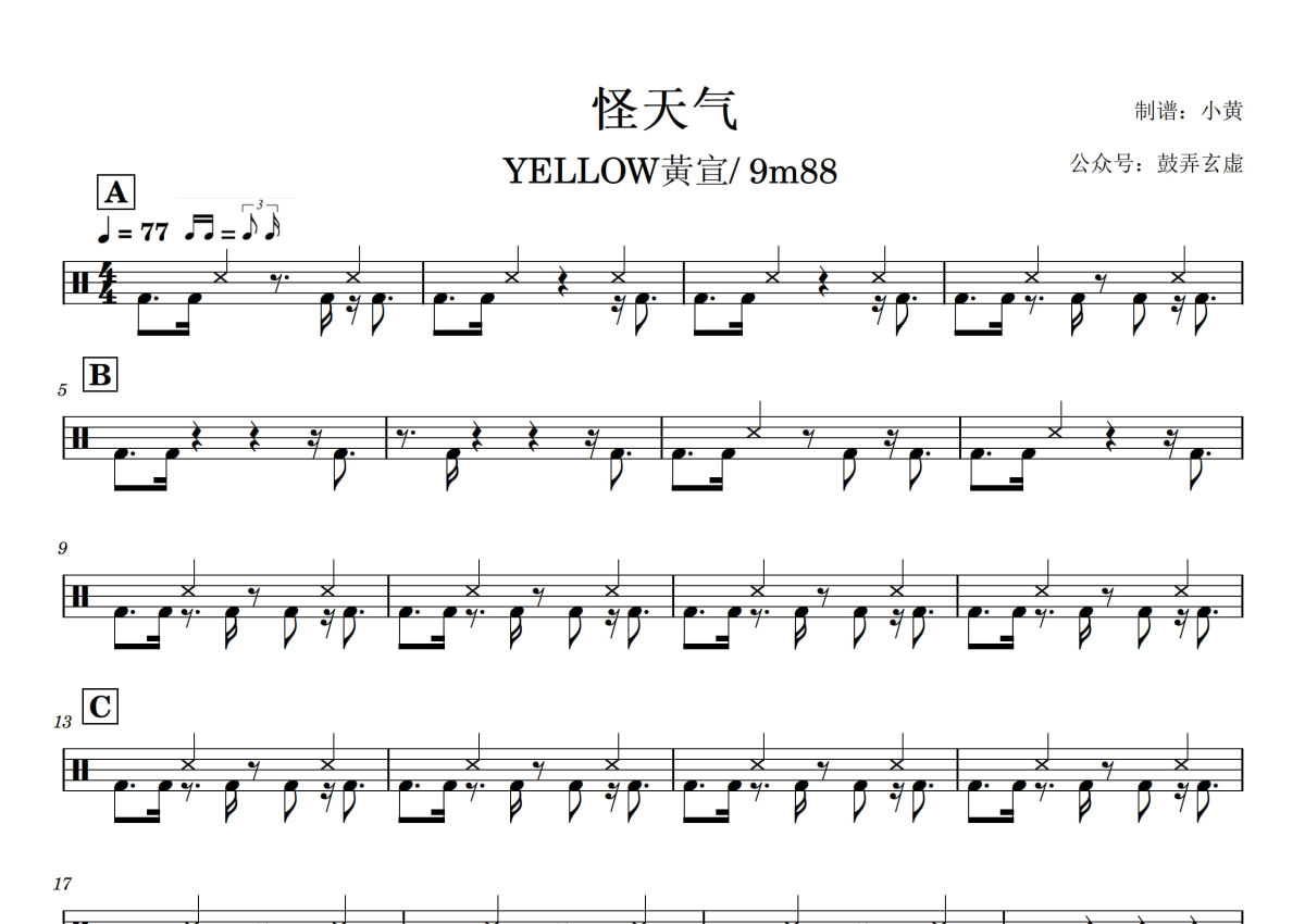 《怪天气》是YELLOW黃宣&9m88演唱的一首歌曲,拍号为4/4拍,歌曲速度为每分钟77拍,这份架子鼓谱共有三张高清图谱,图谱由 @小黄 编配上传,图谱使用五线谱编配,使用这份怪天气架子鼓谱,你将能够轻松地敲打出这首YELLOW黃宣&9m88的怪天气,快来尝试吧。
