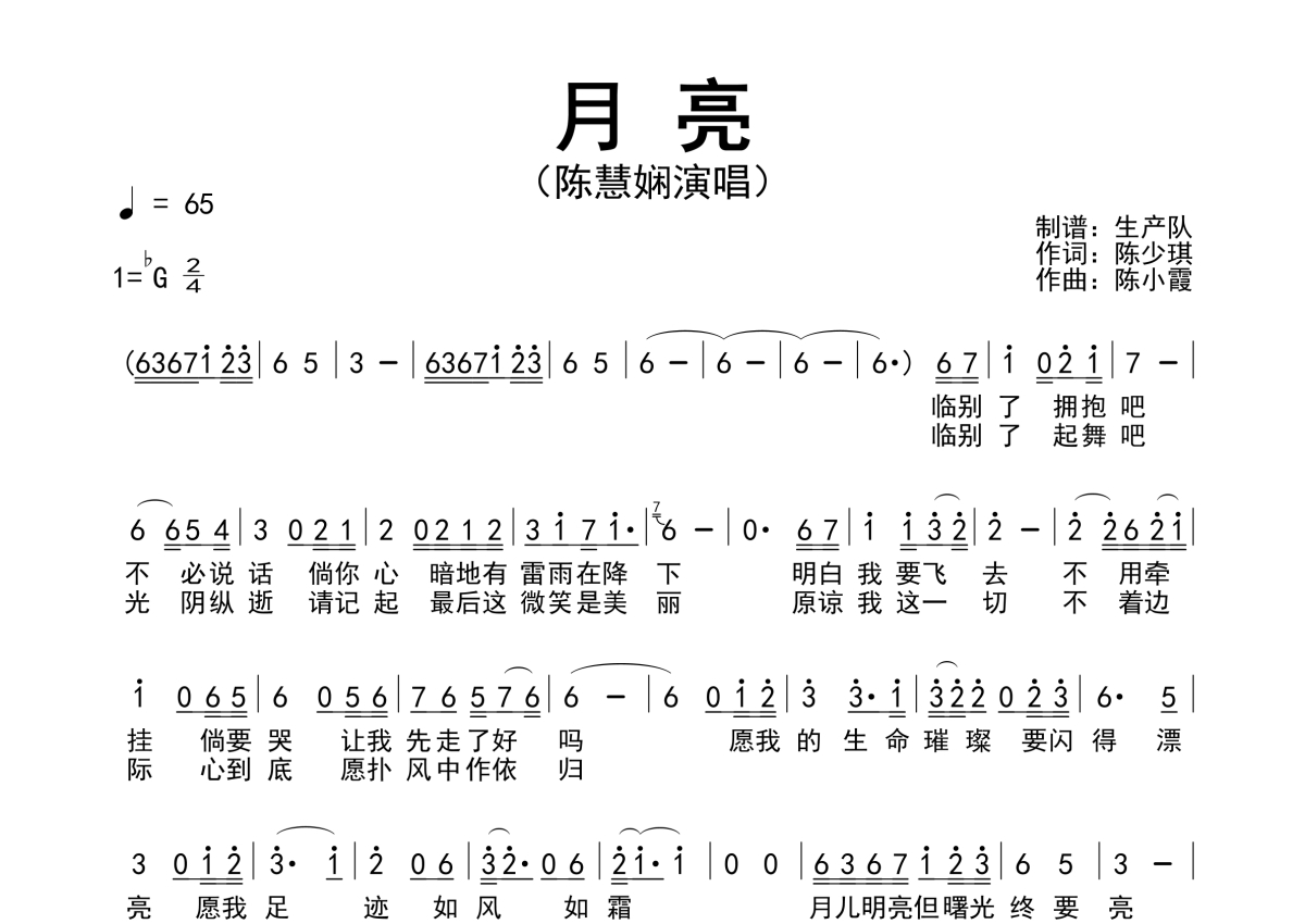 《月亮》是陈慧娴演唱的一首歌曲,原版简谱,拍号为2/4拍,歌曲速度为每分钟65拍,这份简谱共有一张高清图谱,图谱由 @生产队 编配上传陈慧娴演唱的粤语歌曲《月亮》原版简谱。