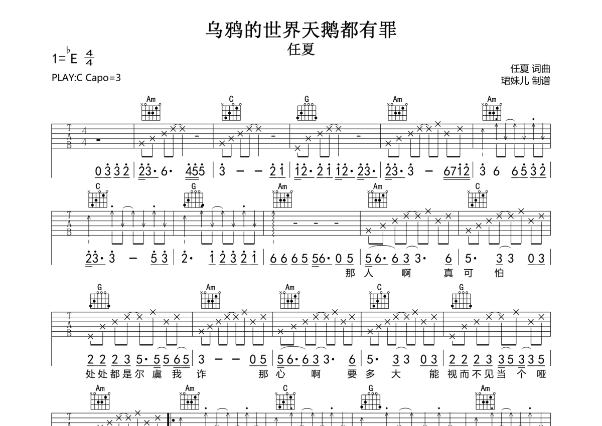 《乌鸦的世界天鹅都有罪》是任夏演唱的一首歌曲,拍号为4/4拍,歌曲速度为每分钟85拍,歌曲原调为E调,但由于原调指法比较难,为了方便弹奏,本吉他谱采用的是C调指法编配,变调夹3品弹奏即为原调,当然也可以根据自己的音域改变变调夹位置,或者通过改变和弦调性,以方便自己弹奏,这份吉他谱共有两张高清图谱,图谱由 @珺妹儿 编配上传,图谱使用六线谱编配,包含吉他和弦指法、简谱以及歌词部分,使用这份乌鸦的世界天鹅都有罪吉他谱,可以让你更加方便地掌握这首歌曲的弹唱技巧,快来尝试吧。