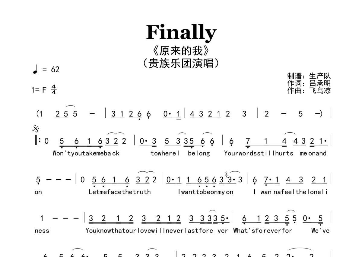 《Finally(原来的我)》是原来的我演唱的一首歌曲,原版简谱,拍号为4/4拍,歌曲速度为每分钟62拍,这份简谱共有一张高清图谱,图谱由 @生产队 编配上传。