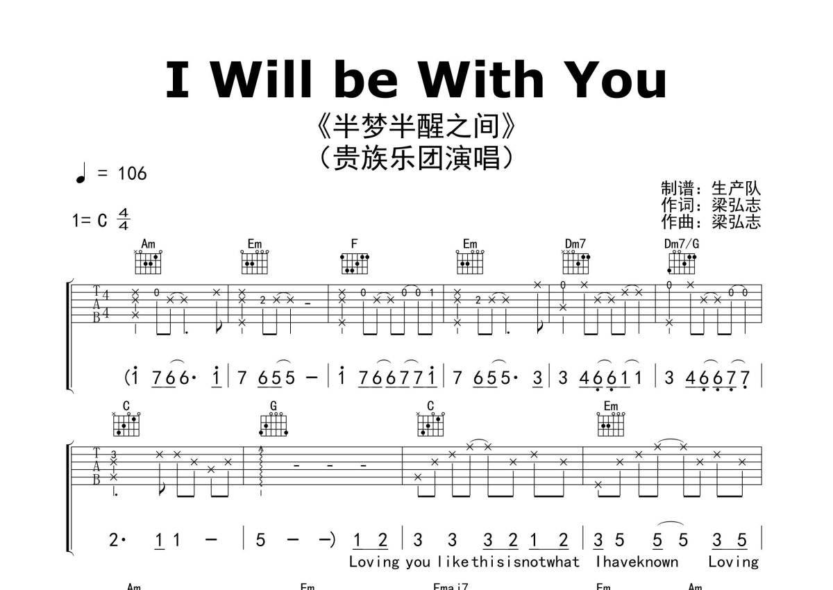 《I Will be With You(半梦半醒之间)》是贵族乐团演唱的一首歌曲,精编完美版,拍号为4/4拍,歌曲速度为每分钟106拍,歌曲原调为C调,本吉他谱采用的是C调指法编配,演奏时不需要使用变调夹即为原调,这份吉他谱共有三张高清图谱,图谱由 @生产队 编配上传,图谱使用六线谱编配,包含吉他和弦指法、简谱以及歌词部分,使用这份I Will be With You(半梦半醒之间)吉他谱,可以让你更加方便地掌握这首歌曲的弹唱技巧,快来尝试吧。