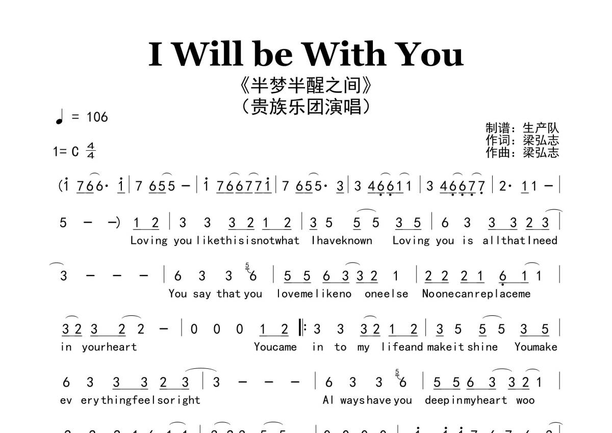 《I Will be With You(半梦半醒之间)》是贵族乐团演唱的一首歌曲,原版简谱,拍号为4/4拍,歌曲速度为每分钟106拍,这份简谱共有一张高清图谱,图谱由 @生产队 编配上传。