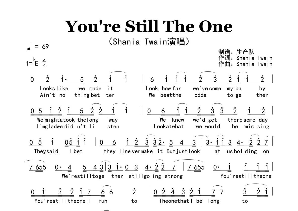 《You're Still The One》是Shania Twain演唱的一首歌曲,原版简谱,拍号为4/4拍,歌曲速度为每分钟69拍,这份简谱共有一张高清图谱,图谱由 @生产队 编配上传。