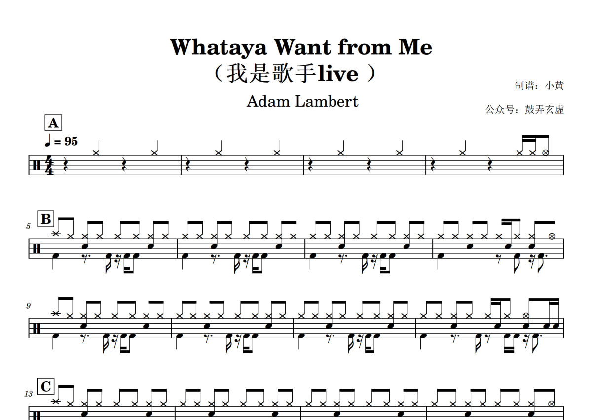 《Whataya Want from Me (live)》是live演唱的一首歌曲,拍号为4/4拍,歌曲速度为每分钟95拍,这份架子鼓谱共有三张高清图谱,图谱由 @小黄 编配上传,图谱使用五线谱编配,使用这份Whataya Want from Me (live)架子鼓谱,你将能够轻松地敲打出这首live的Whataya Want from Me (live),快来尝试吧。