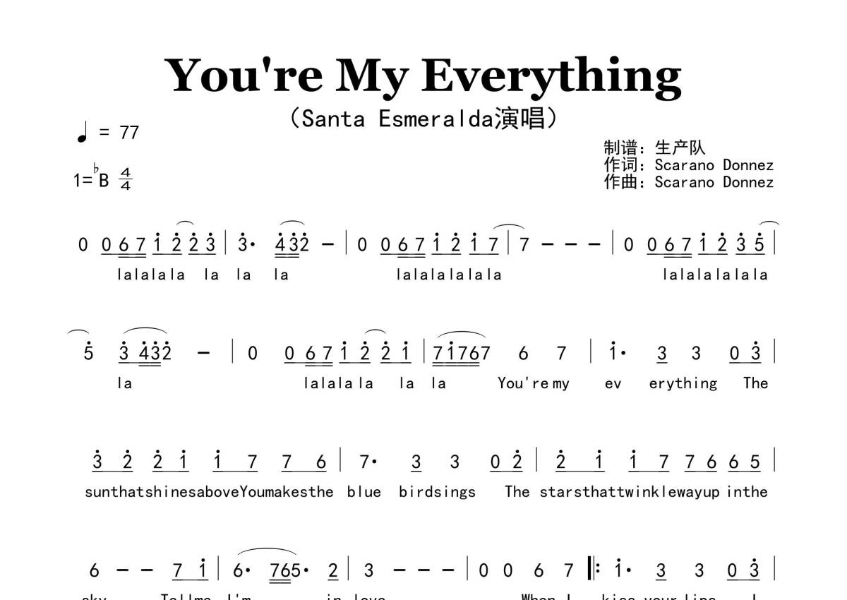 《You're My Everything》是Santa Esmeralda演唱的一首歌曲,原版简谱,拍号为4/4拍,歌曲速度为每分钟77拍,这份简谱共有两张高清图谱,图谱由 @生产队 编配上传。