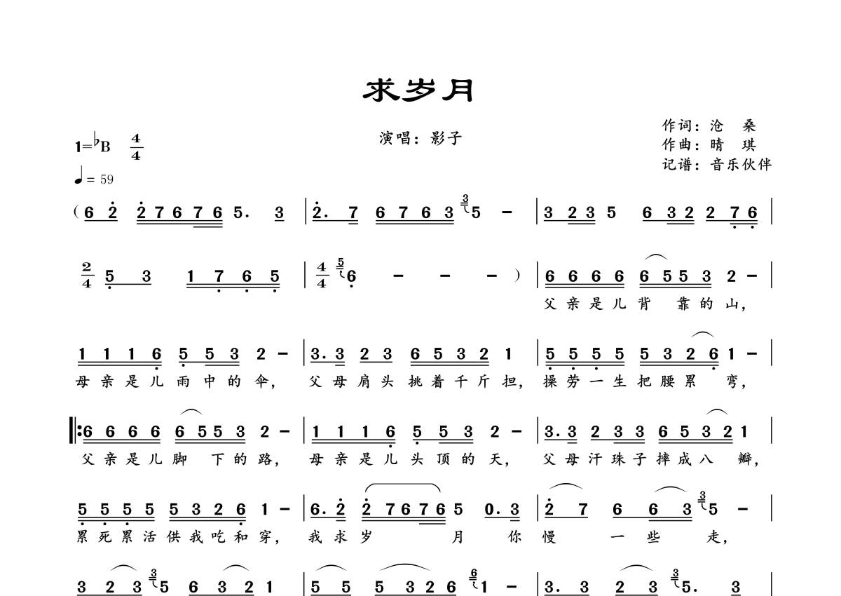 《求岁月》是影子演唱的一首歌曲,拍号为4/4拍,歌曲速度为每分钟59拍,这份简谱共有一张高清图谱,图谱由 @音乐伙伴 编配上传。