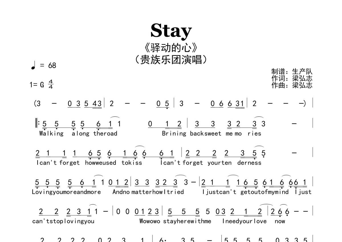 《Stay(驿动的心)》是驿动的心演唱的一首歌曲,原版简谱,拍号为4/4拍,歌曲速度为每分钟68拍,这份简谱共有一张高清图谱,图谱由 @生产队 编配上传。