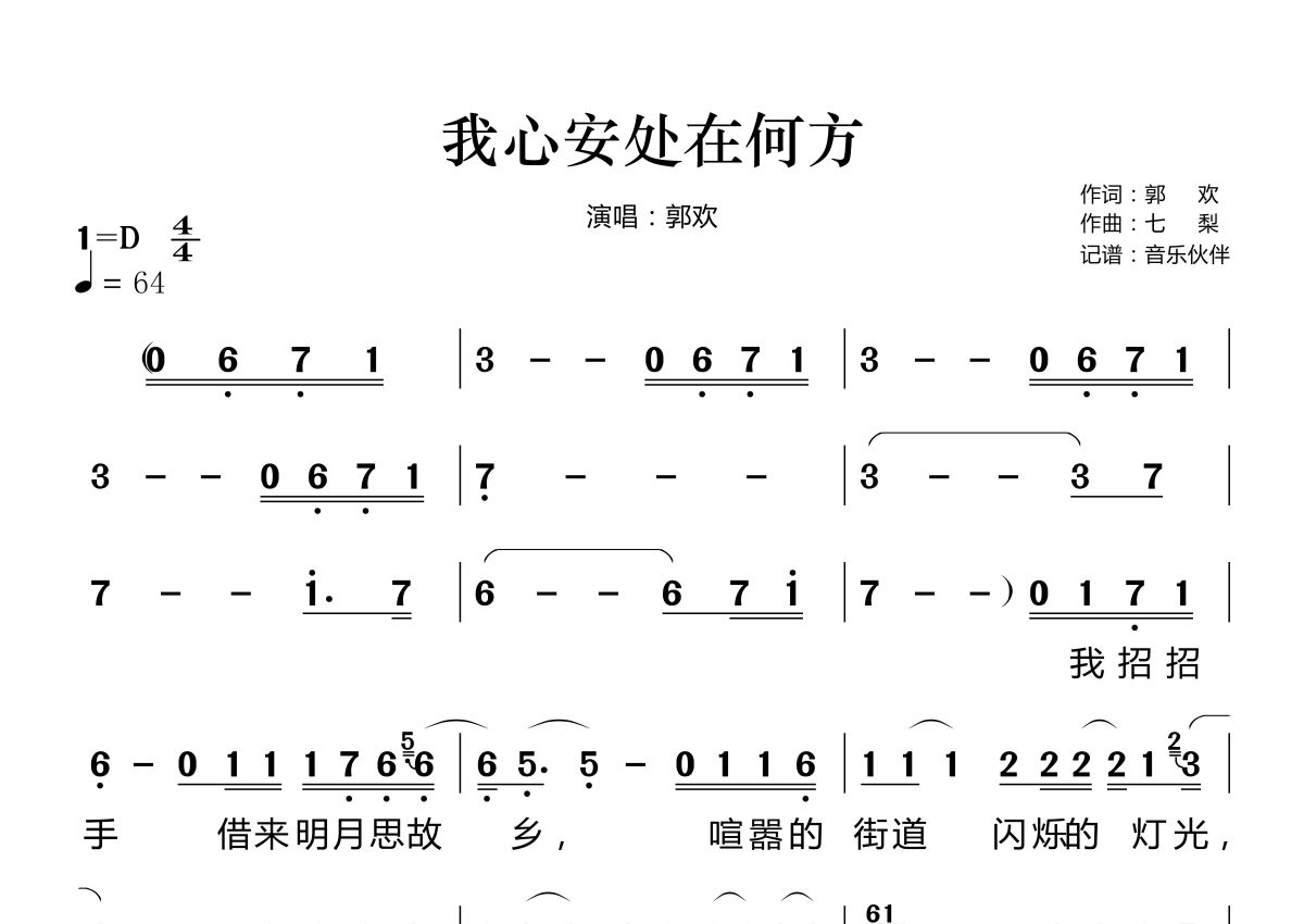 我心安处在何方简谱 - 郭欢演唱