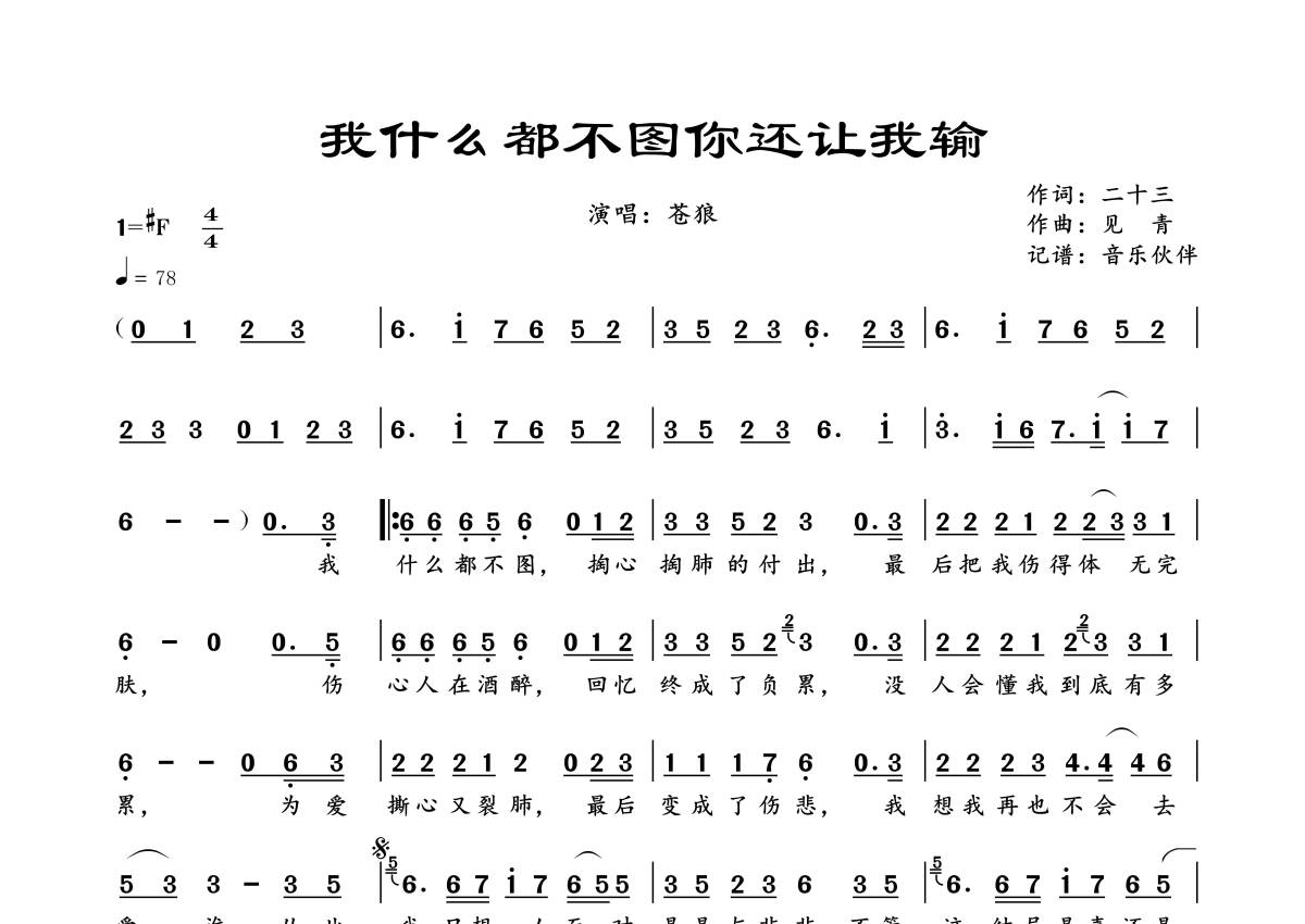 《我什么都不图你还让我输》是苍狼演唱的一首歌曲,拍号为4/4拍,歌曲速度为每分钟78拍,这份简谱共有一张高清图谱,图谱由 @音乐伙伴 编配上传。