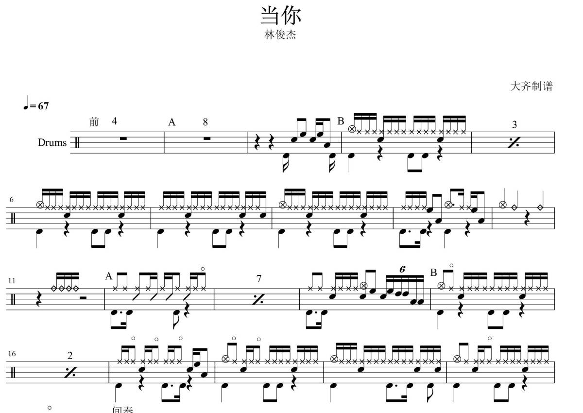 《当你》是林俊杰演唱的一首歌曲,这份架子鼓谱共有一张高清图谱,图谱由 @大张齐鼓现代打击乐培训 编配上传,图谱使用五线谱编配,使用这份当你架子鼓谱,你将能够轻松地敲打出这首林俊杰的当你,快来尝试吧。《当你》是王心凌演唱的歌曲,由张思尔填词,林俊杰谱曲,收录在专辑《Cyndi Begin》中。 此歌曲是电视剧《西街少年》插曲 。 此歌曲是电视剧《背叛爱情》中文版主题曲 。
