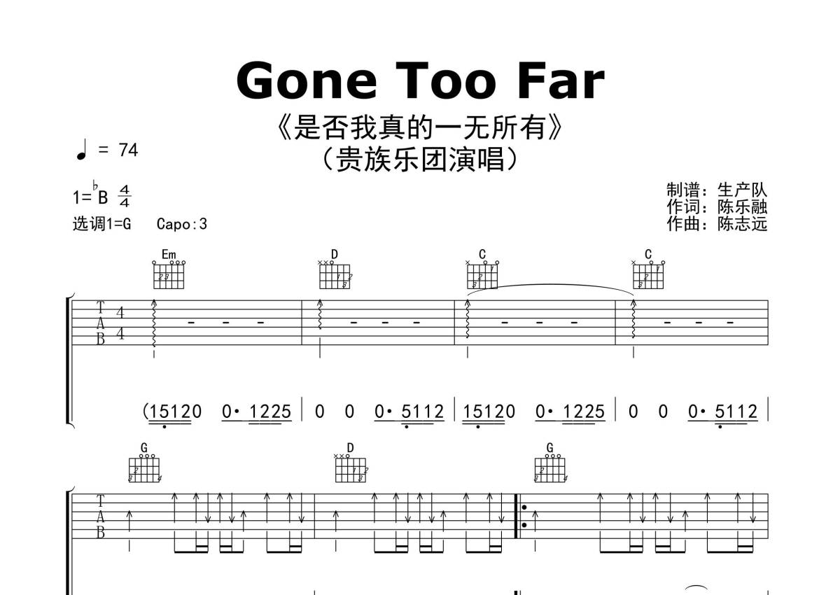 《Gone Too Far(是否我真的一无所有)》是是否我真的一无所有演唱的一首歌曲,精编完美版,拍号为4/4拍,歌曲速度为每分钟74拍,歌曲原调为Bb调,但由于原调指法比较难,为了方便弹奏,本吉他谱采用的是G调指法编配,变调夹3品弹奏即为原调,当然也可以根据自己的音域改变变调夹位置,或者通过改变和弦调性,以方便自己弹奏,这份吉他谱共有三张高清图谱,图谱由 @生产队 编配上传,图谱使用六线谱编配,包含吉他和弦指法、简谱以及歌词部分,使用这份Gone Too Far(是否我真的一无所有)吉他谱,可以让你更加方便地掌握这首歌曲的弹唱技巧,快来尝试吧。