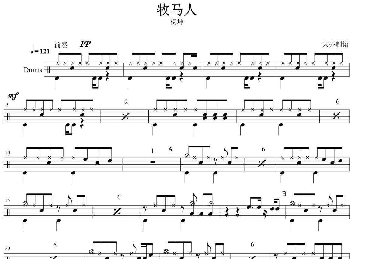 《牧马人》是杨坤演唱的一首歌曲,拍号为4/4拍,歌曲速度为每分钟121拍,这份架子鼓谱共有两张高清图谱,图谱由 @大张齐鼓现代打击乐培训 编配上传,图谱使用五线谱编配,使用这份牧马人架子鼓谱,你将能够轻松地敲打出这首杨坤的牧马人,快来尝试吧。《牧马人》是是中国创造歌手杨坤演唱的一首歌,由文雅填词,杨坤谱曲,歌曲MV由TOM执导,收录在杨坤2007年4月22日发行的同名专辑《牧马人》中。 2007年5月18日《牧马人》上榜中国音乐联播榜第93期第三名。
