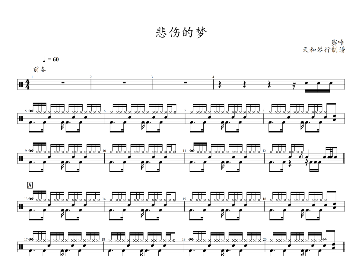 《悲伤的梦》是窦唯演唱的一首歌曲,拍号为4/4拍,歌曲速度为每分钟60拍,这份架子鼓谱共有三张高清图谱,图谱由 @音符喷血者 编配上传,图谱使用五线谱编配,使用这份悲伤的梦架子鼓谱,你将能够轻松地敲打出这首窦唯的悲伤的梦,快来尝试吧。