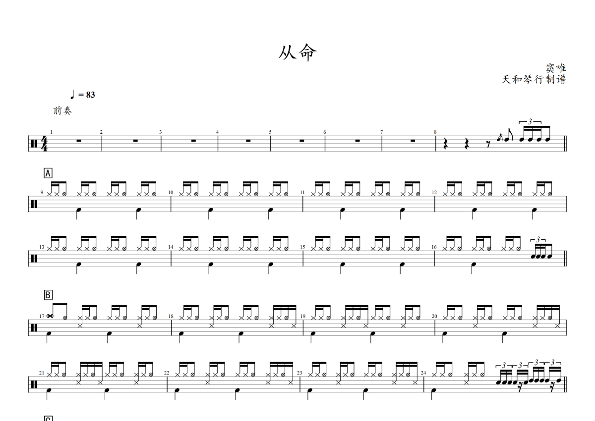 《从命》是窦唯演唱的一首歌曲,拍号为4/4拍,歌曲速度为每分钟83拍,这份架子鼓谱共有两张高清图谱,图谱由 @音符喷血者 编配上传,图谱使用五线谱编配,使用这份从命架子鼓谱,你将能够轻松地敲打出这首窦唯的从命,快来尝试吧。